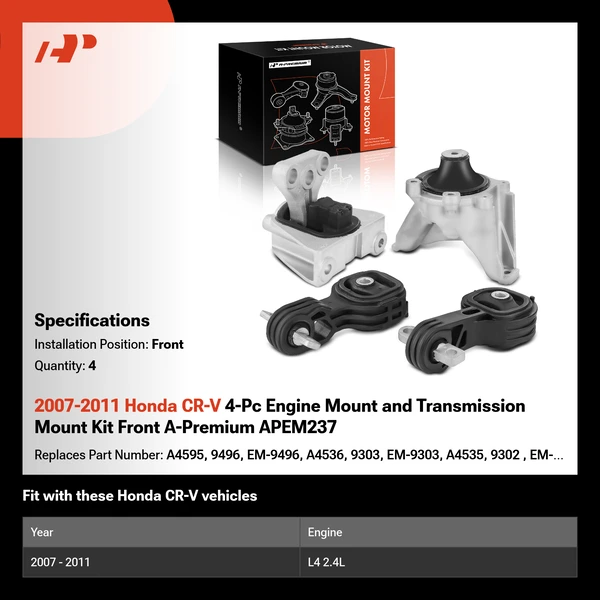 - [Specifications]: Quantity: 4, Installation Position: Front, Kit Parts Included: 1x Front Right Engine Mount without Bracket; 1x Front Lower Engine Torque Strut Mount; 1x Front Upper Engine Torque Strut Mount; 1x Transmission Mount