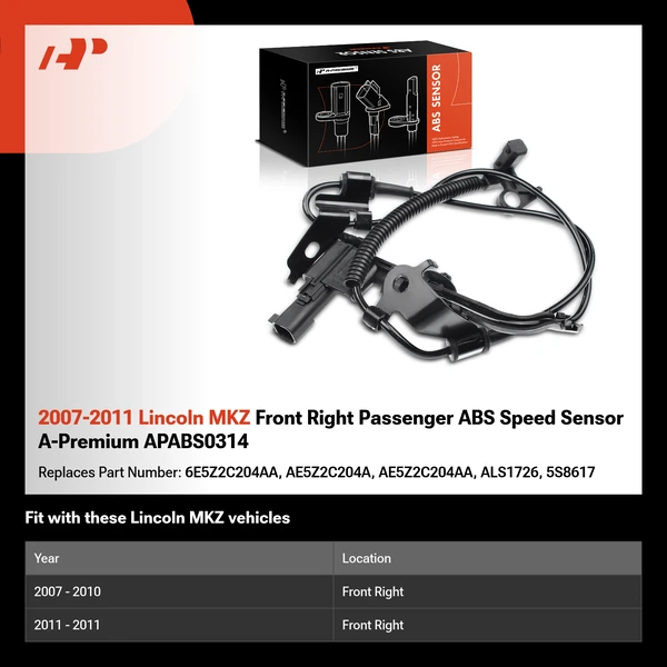High quality A-Premium aftermarket parts - ABS Speed Sensor A-Premium offers a 3-Year unlimited mileage warranty on our expertly engineered ABS Speed Sensor Replacement for cars. Get the perfect car ABS Speed Sensor match for your vehicle by using our Vehicle Selector.