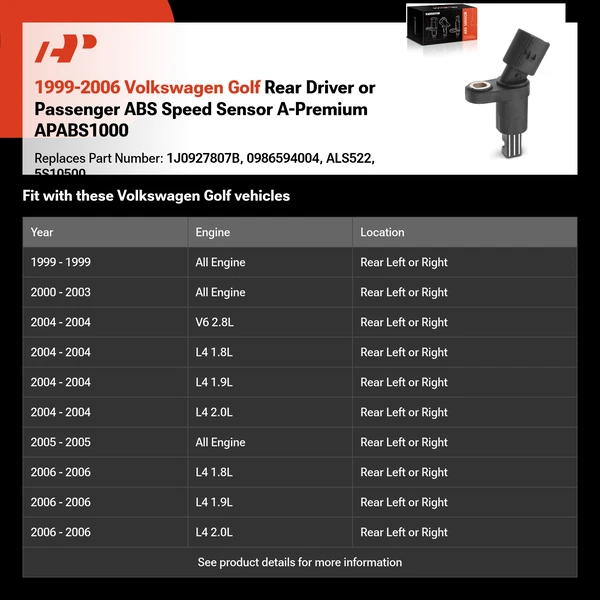 A-Premium Aftermarket ABS Speed Sensor: Ideal for Trucks, Cars, and VansA-Premium ABS Speed Sensor is designed to meet the unique demands of trucks, cars, and vans. Our expertly crafted replacements come with a 3-Year unlimited mileage warranty, guaranteeing reliability across a wide range of vehicles. Use our Vehicle Selector to find the right ABS Speed Sensor for your needs.